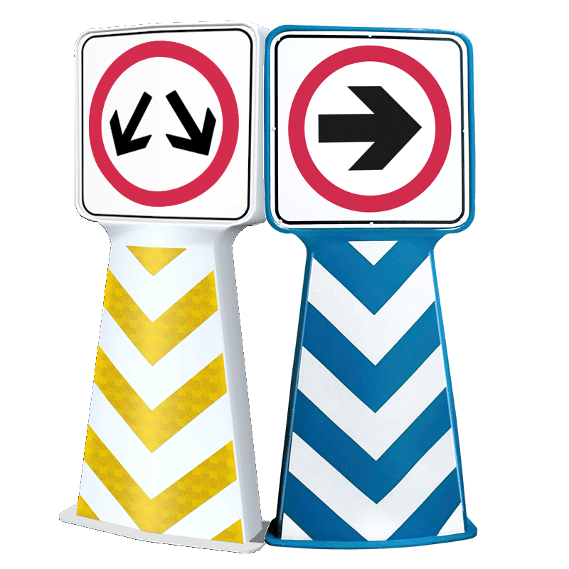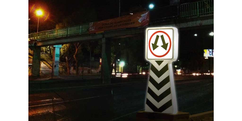Dispositivo luminoso cuya principal función es desviar el tráfico en cuchillas, accesos y salidas en avenidas o carreteras, en caso de ser impactado por su forma absorbe parte del impacto.