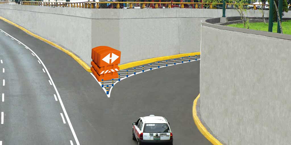 Amortiguador de impactos recomedado para colocarse en desviaciones, cuchillas, salidas y entradas a vías rápidas o pasos subterráneos, etc.