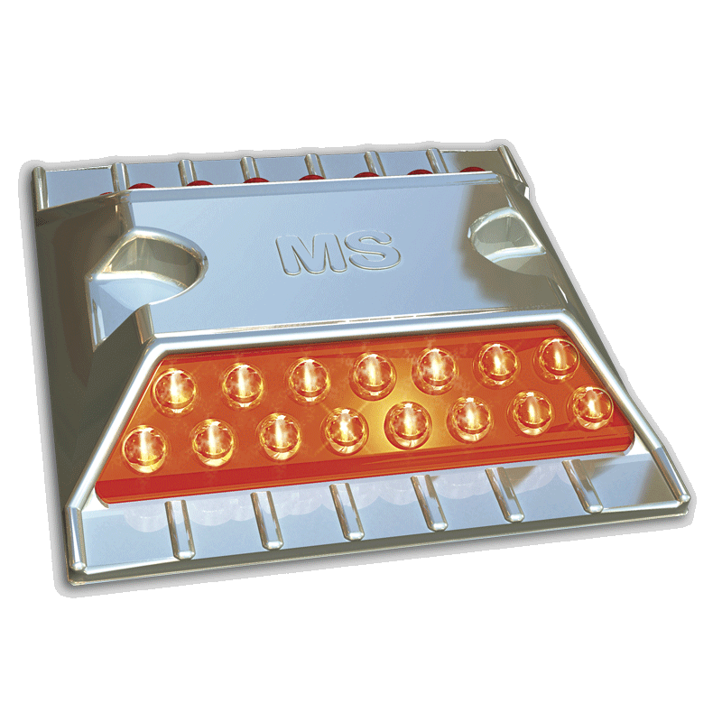 Elegante y vistosa vialeta de acero inoxidable con 15 esferas reflejantes por lado que incrementan su reflectividad.
